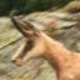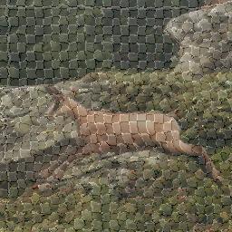 | Inverted: Each little block is a central symmetry of the source's. I obtained this with the same equation y-(x%16) as the previous one, but doubled the modulo. Then, instead of reading always the same pixel, inside one block, we read backward...